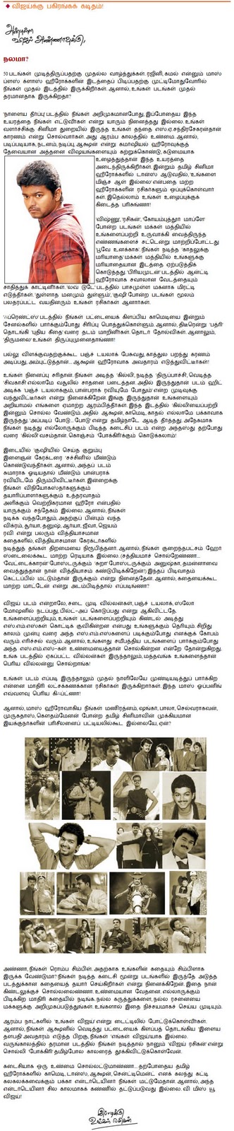 Vijays 52 nd film title - Velayutham, director- Raja source- sun news (cinema news) Grand function for velayutham.... Today morning i meet our fan club state leader JAYASEELAN n my town, he told tat velayutham pooja will be in nehru stadium at 21st june in very grand manner. More than 10,000 fan club members will expecteded to come and grace the occation, also he mension that very disappointing one no note book from fan club this year bcoz of political pressure..... Evening again i will meet him.. Thanks...... |