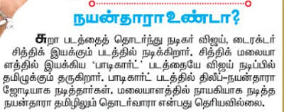 Last week Ilayathalapathy Vijay was shown a sneak preview of director Siddique’s Malayalam film Bodyguard at a Chennai preview theatre. He was accompanied by his wife Sangeeta. The film has Dileep and Nayanthara in the lead and is releasing in Kerala on January 21. Siddique is one of the most successful film directors in south India who has made 9 films in 22 years and all of them have been super hits. Vijay and Siddique go a long way back to their Friends days. It seems Vijay loved Bodyguard a romantic comedy with some family sentiments and action, and wants to remake it as his 51st film after he completes Sura. Says Siddique: “Actually when I narrated Bodyguard story to Vijay two years back he was very keen to do it first in Tamil, but I always try out my films in Malayalam then only I will do in other languages.” Last week when Vijay was in Thiruvananthapuram, he told the media that after Sura, he will be doing the remake of the Siddique film. The buzz is that he is waiting for Bodyguard to release and gauge its box-office performance, before formally announcing its remake as his next project http://sify.com/movies/tamil/fullstory.php?id=14927788 |